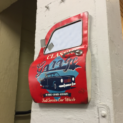 Our vintage style hanging metal signs are a fun way to dress up any garage, cafe, man cave or home bar. Made of durable metal and suitable for indoor or outdoor use. Measures 16.25” x 2.5” x 18.325” and comes with built in hangers for easy installation. Window is a mirror. Dress up your man cave or bar with this hard to find item that is the perfect addition for the automotive or vintage enthusiast.