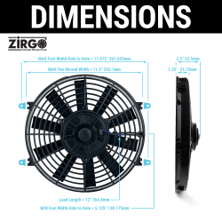 To ensure maximum performance, all Zirgo fans offer reversible blades allowing them to operate as pushers or pullers. Zirgo's four foot mounting brackets & ULTRA SLIM PROFILE ensures easy placement for maximum performance on your vehicles cooling system.