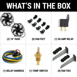 ZIRGO SUPER COOL PACKThis kit contains everything you need to install and control your Zirgo fan! Ideal for converting from a mechanical fan to enhance horsepower and efficiency. Also works great for oil, condenser, and transmission cooling. Works anywhere you need cooling.