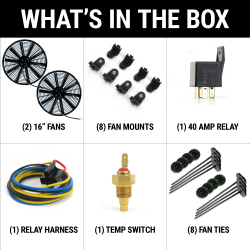 ZIRGO SUPER COOL PACKThis kit contains everything you need to install and control your TWIN Zirgo fans! Ideal for converting from a mechanical fan to enhance horsepower and efficiency. Also works great for oil, condenser, and transmission cooling. Works anywhere you need cooling.