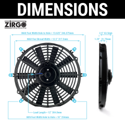 12" Zirgo 1248 fCFM High Performance Black Straight Blade Radiator Cooling Fan