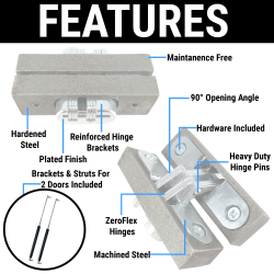 AutoLöc’s 2 Door Universal Manual Lift Gullwing Hinge Conversion Kit can lift your doors up to a full 180 degrees! Our Heavy Duty Hardened Plated Steel ZERO FLEX Hinges and Heavy Duty 220lb Gas Struts are made to hold up almost any vehicle door. NO SAG design makes for easy alignment, allowing for smooth and consistent operation every time.