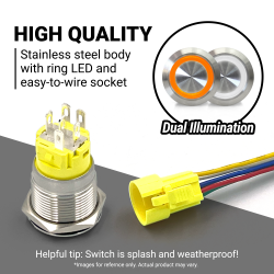 These switches are commonly used for automotive, marine, and industrial applications. They are also waterproof (IP66), making them ideal for both exterior or interior mounting on cars, trucks, or boats. Endless possibilities! Use to operate power windows, door locks, engine start, sunroofs, electric motors, linear actuators, tonneau covers, headlights, horns, RV / camper van panels, and much much more!