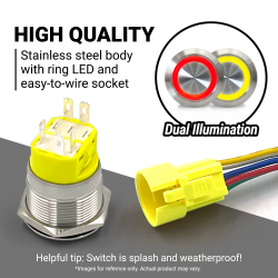22mm Billet 12V Momentary Push Button Switch Red and/or Yellow LED Light Illuminated Ring Brushed Metal With Harness IP66 Universal for Custom Car Truck Open Close On Off Start Horn Engine & More!