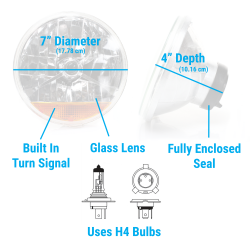 * H4 bulbs, turn signal bulb, and wiring harness included.
