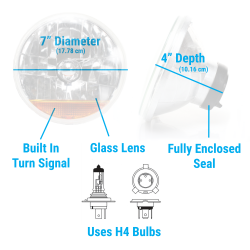 Turn the night into day! AutoLoc's 7" Inch Round Snake Eye Halogen Headlight Assembly with Amber Turn Signal Lights gives you an extra-wide range of visibility when driving at night. Designed with reflective internal housing and Autoloc's exclusive Omni-View Technology, this Round Snake Eye Headlight Assembly with Turn Signal Light delivers maximum directional light output.