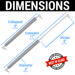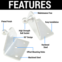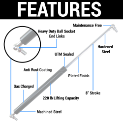 This kit is ideal for helping to lift and stabilize vehicle doors, trunks, hatches, hoods, or any other application that requires heavy lifting. Designed to withstand high-stress in high performance applications. Kit includes a 220lb Lift 17" Sealed Gas Charged Strut with 2 Heavy Duty Ball Stud Angle Mounting Brackets.