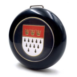 This horn button features the Cologne Germany flag/crest badge which comes in brightly enameled red, white, and gold.