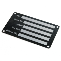 This anodized aluminum VIN plate with metallic finish is the perfect touch to any dash. Comes in black and silver. Tag your custom trailer, truck or equipment! Great for replacing lost, damaged or just hard to read identification plates. These tags meet inspection requirements for DMV, DOT, FMCSA, RRC, ICC and FMVSS. Let others know who is the proud owner. Personalize the blank fields to create a truly custom piece of art. This VIN name plate is 3.75 inches wide by 2.125 inches tall and is .5mm thick. It includes 3.5mm rivet holes in each corner for easy mounting. Fits all vehicles.