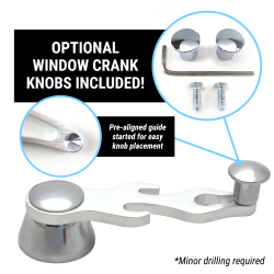 Levers include optional use knobs. The optional knobs can be fit to the tip of the handle. See additional images for reference. AutoLöc door handle levers can be used both as a door handle lever or as a window crank handle, with or without knobs. To mount knobs on lever simply use the pre-aligned guide started on the back of the lever. Includes allen wrench and screws. Minor drilling required.