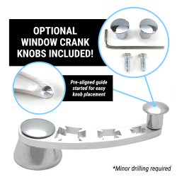 Kit works on any vehicle with factory or aftermarket power windows. Ideal for hot rods, street rods, classic, vintage and antique vehicles, custom cars, trucks and more! Optional window crank handle knobs are included with kit, but are not necessary for use. Minor drilling is required to if you choose to use knobs.