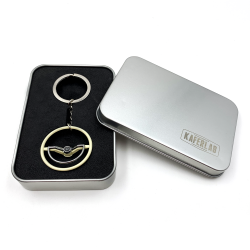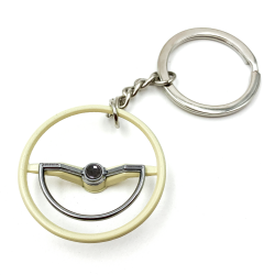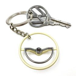 A perfect 1960-63 VW Beetle Dished steering wheel keychain! These keychains are perfect replica of the VW aircooled 1960-63 VW Beetle Dished steering wheels from back in the day. Each Volkswagen steering wheel keychain offers identical scale details just like the factory Volkswagen steering wheel. Precision cast from alloy and then hand painted and assembled with a high quality chrome keychain & ring. You can customize your keychain by installing one of the 9 interchange horn button decals. These VW keychains are available in factory Beige, Black, and limited edition chrome. Makes the perfect gift for your Volkswagen aircooled fan!