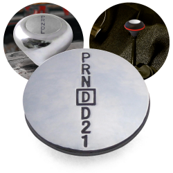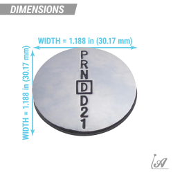 This polished button medallion features the PRNDD21 shift pattern. See below if you would prefer a different shift pattern medallion.