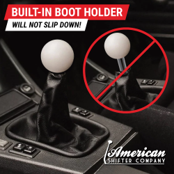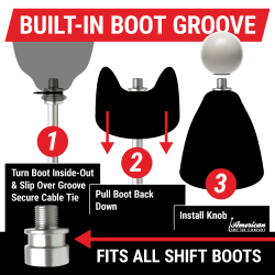 This heavy-duty polished billet aluminum adapter stays put with the help of 3 robust set screws. On top of that we added “The Boot Groove,” which neatly tucks your shift boot under the knob for a more tailored look.