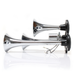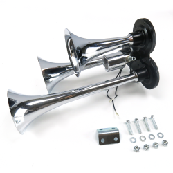 Now you can toot your own horn with The Duke 3 Trumpet High Output Train Horn! Offering that patented train sound at 12/24 volts with an output of 120 5dB, the Duke™ sounds like the real thing! Comes with 3 heavy duty chrome plated trumpets, along with mounting brackets, air fittings, and detailed instructions that make installation easy.