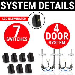 Includes; Complete 4 Door Power Window Kit with 7 Switches, Detailed Instructions, Free Live USA Tech Support, and a Limited Lifetime Warranty.