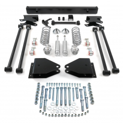 Each 4-Link kit includes custom bolt on brackets, oversized stainless steel adjusters, full upper coilover crossmember, panhard bar, 1" OD tubing oversized 4-link bars, deluxe coilover shocks, powder coated springs, axle brackets, bolt on chassis bracket, mounting hardware, and detailed instructions.
