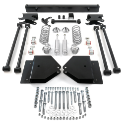Every kit comes loaded: custom bolt-on brackets, beefy oversized steel adjusters, a full upper coilover crossmember, panhard bar, stout 1" OD heavy-wall 4-link bars, deluxe coilover shocks, powder-coated springs, axle brackets, chassis mounts, all the hardware, and clear instructions even your buddy can follow.