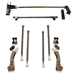 Each 4-link kit includes custom bolt on brackets, oversized stainless steel adjusters, full upper coilover crossmember, panhard bar, 1" OD tubing oversized 4-link bars, axle brackets, bolt on chassis bracket, mounting hardware, and detailed instructions. Does not include shocks, springs or Hardware.